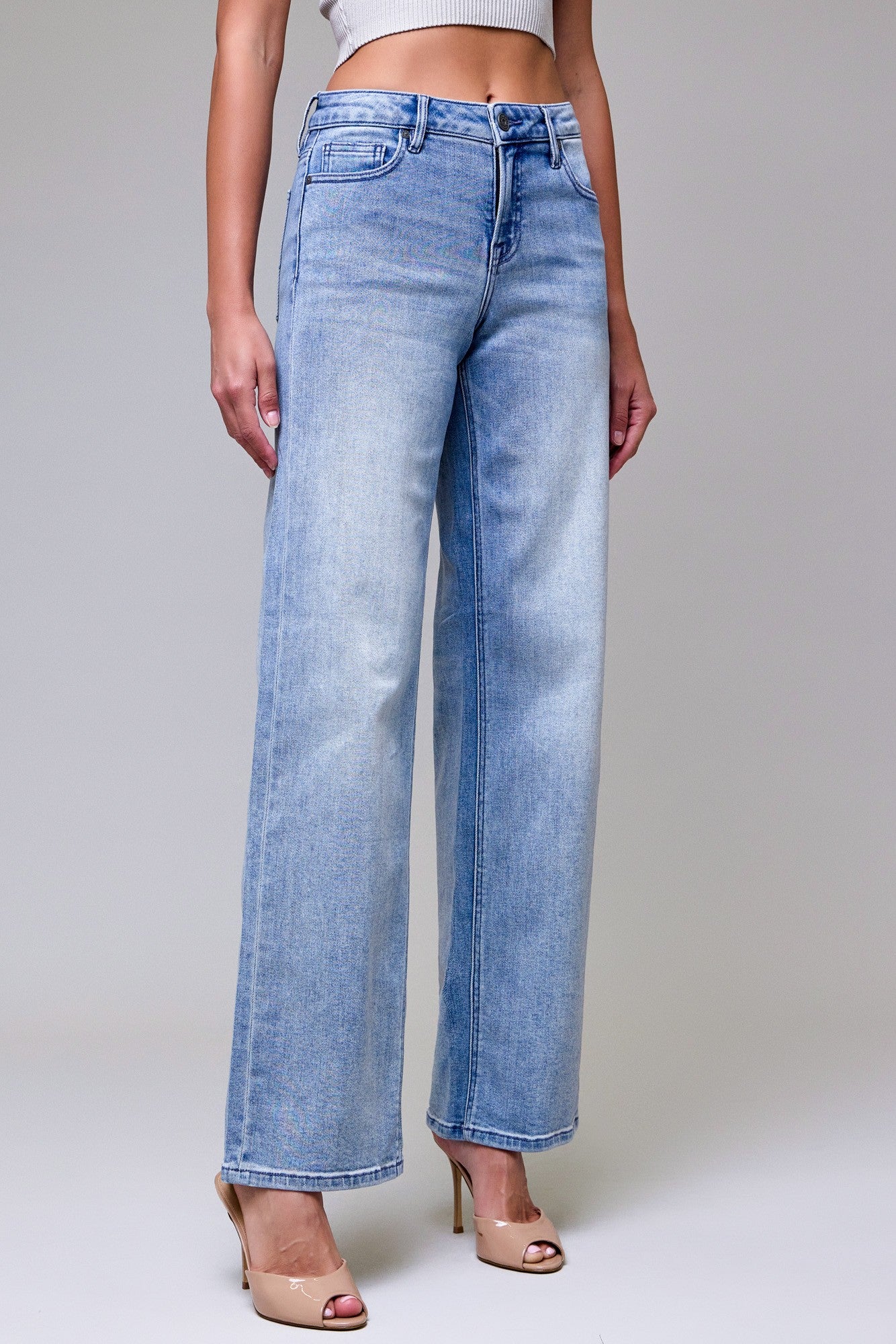 The Monica Light Wash Mid Rise Dad Jeans bring a '90s-inspired look to your closet. Light vintage wash denim shapes these mid-rise jeans with a relaxed "Dad" fit and wide leg silhouette.